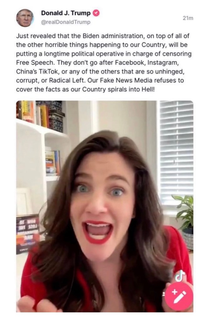 Trump acusó a la Administración Biden de «poner a un agente político de larga data a cargo de censurar la libertad de expresión» en una publicación de Truth Social el sábado por la noche.