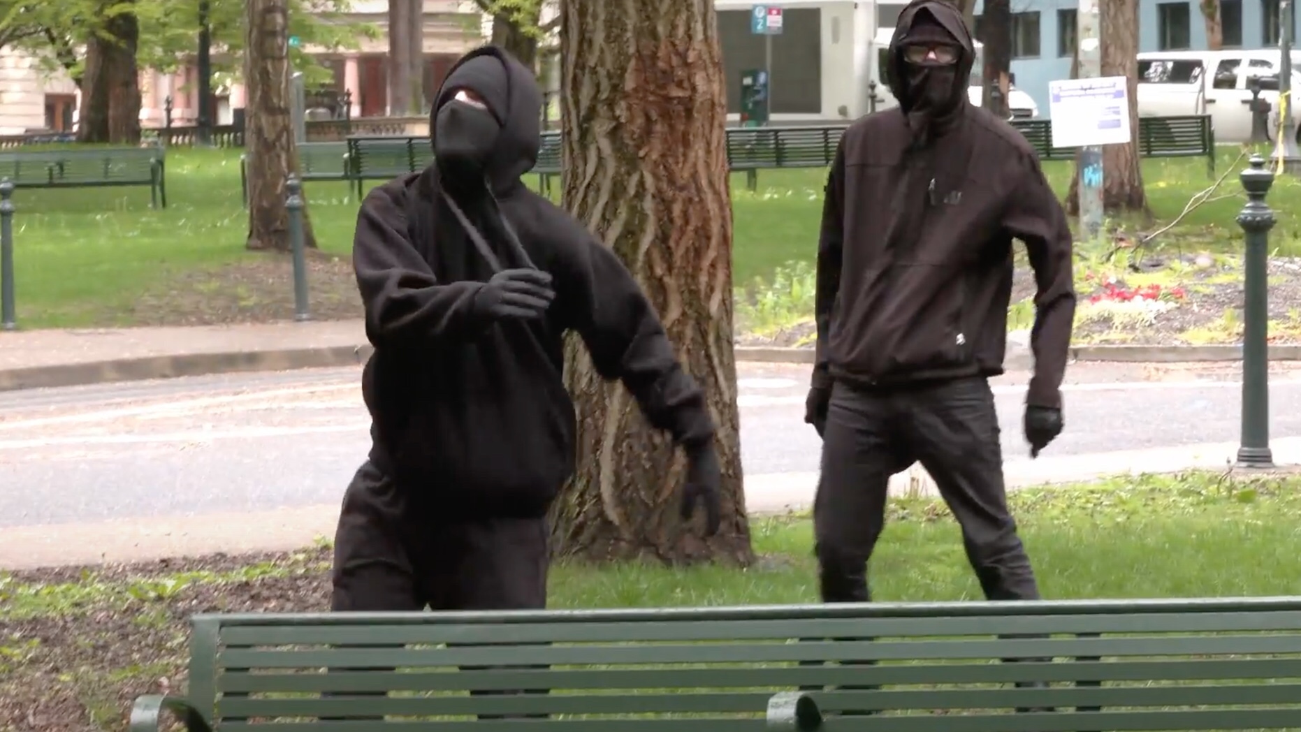 Cuando los oficiales tuvieron «recursos suficientes» para establecer una escena del crimen cerca de Southwest 3rd y Main Street, los manifestantes vestidos de negro ya se habían dispersado después de lanzar granadas de humo, globos llenos de pintura y fuegos artificiales, según la policía. Dos resultaron heridos por «morteros», dijo la policía.