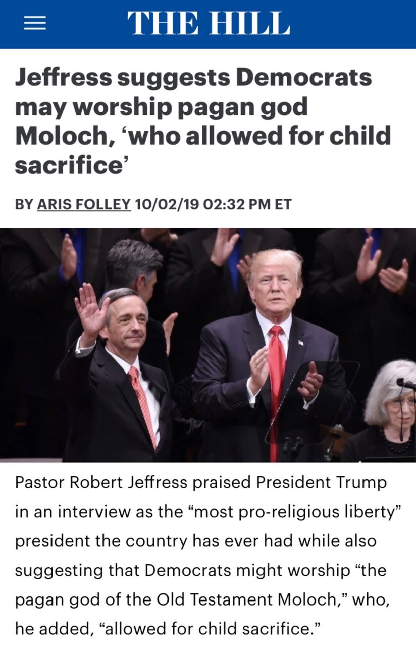 El pastor Robert Jeffress elogió al presidente Trump en una entrevista como el presidente “más pro-libertad religiosa” que el país haya tenido, al tiempo que sugirió que los demócratas podrían adorar al “dios pagano del Antiguo Testamento Moloch”, quien, agregó, “permitió sacrificio de niños”. https://t.me/QAnons_Espana