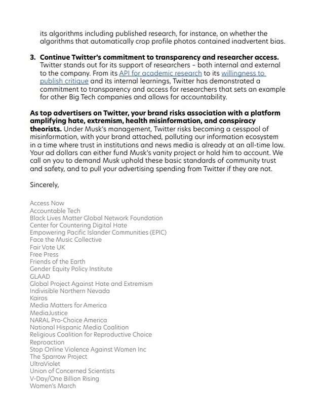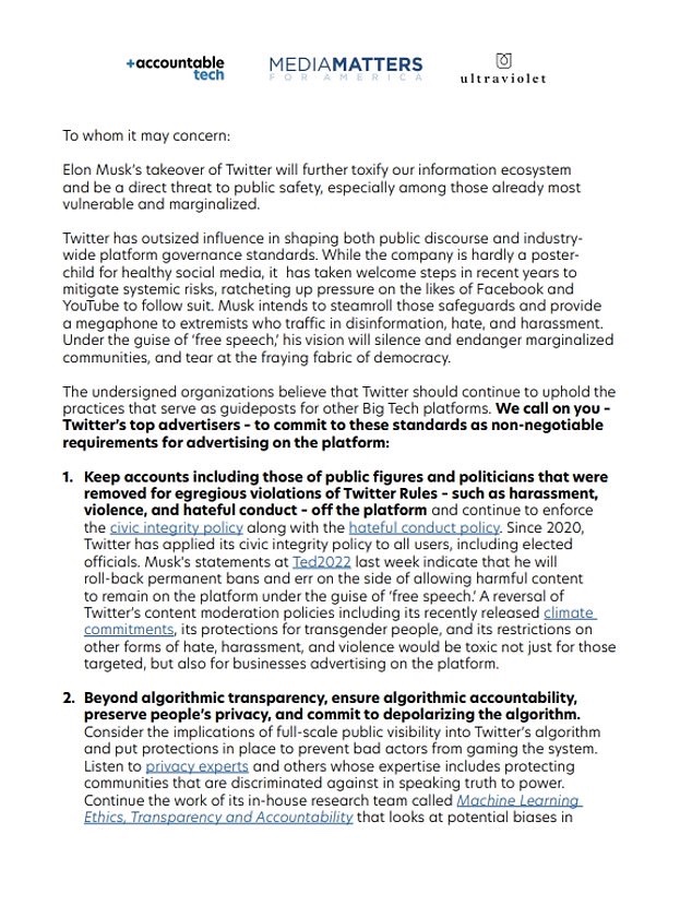 La carta firmada por los 26 grupos se envió en papel con membrete con los logotipos de Accountable Tech, Media Matters for America y Ultraviolet.