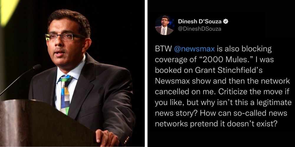 El lunes, el cineasta conservador y podcaster Dinesh D’Souza apuntó al canal de noticias por cable Newsmax por supuestamente bloquear la cobertura de su nueva película «2000 Mules«. La película destaca las preocupaciones sobre el uso de la «cosecha de papeletas» durante las elecciones presidenciales de 2020, que vieron un aumento masivo en el voto anticipado y en ausencia.
