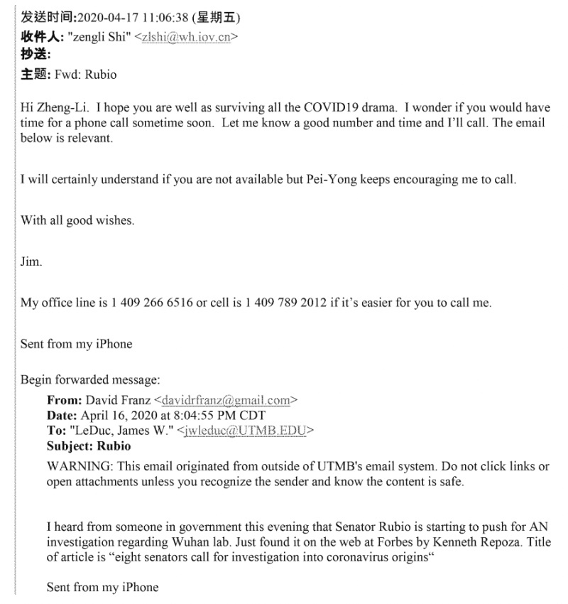 El 16 de abril de 2020, el ex comandante de los EE. UU. El Instituto de Investigación Médica del Ejército de Enfermedades Infecciosas David Franz envió un correo electrónico a LeDuc que «escuchó de alguien en el gobierno esta noche que el senador Rubio está empezando a presionar por UNA investigación sobre el laboratorio de Wuhan» con respecto a los orígenes de la COVID-19.