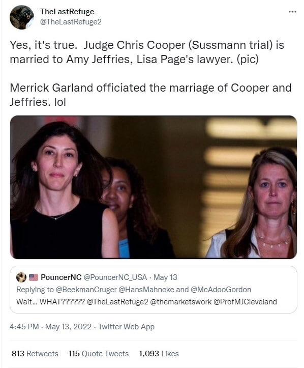 El juez de distrito estadounidense Christopher Cooper dijo anteriormente que conocía a Sussmann en la década de 1990. https://t.me/QAnons_Espana