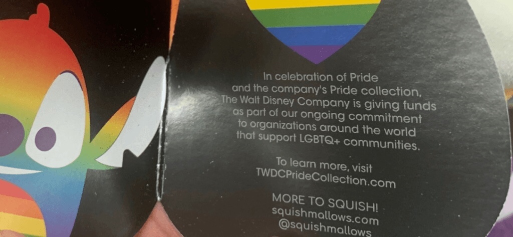 El dorso de la etiqueta dice: «Para celebrar el Orgullo y la colección Pride de la compañía, The Walt Disney Company está donando fondos como parte de nuestro compromiso continuo con organizaciones de todo el mundo que apoyan a las comunidades LGBTQ+». El frente de la etiqueta indica que el juguete de peluche está diseñado para niños «0+».
