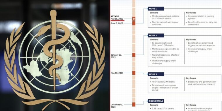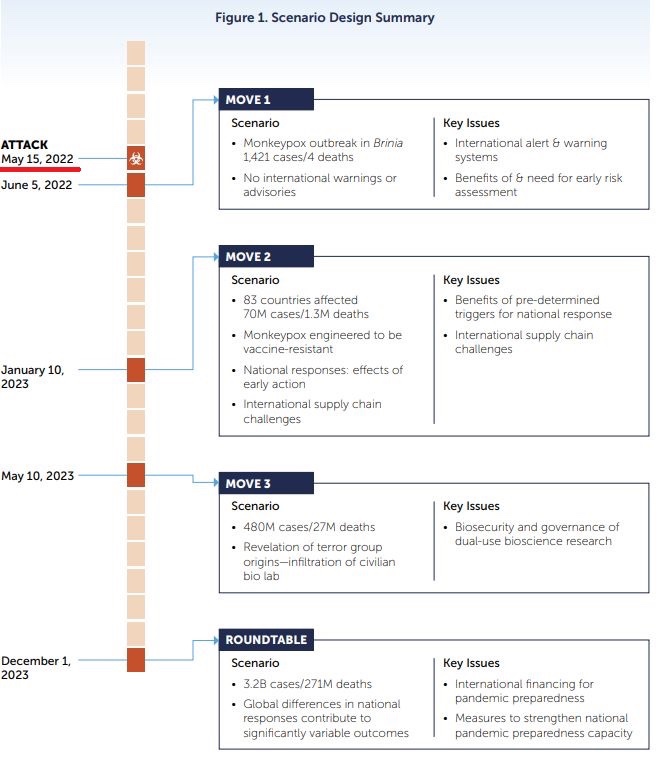 «Desarrollado en consulta con expertos técnicos y políticos, el escenario del ejercicio retrató una pandemia mortal y global que involucra una cepa inusual del virus de la viruela símica que surge por primera vez en el país ficticio de Brinia y finalmente se propaga por todo el mundo», afirma el documento. «Más tarde en el ejercicio, el escenario revela que el brote inicial fue causado por un ataque terrorista utilizando un patógeno diseñado en un laboratorio con disposiciones inadecuadas de bioseguridad y biocustodia y una supervisión deficiente. El escenario del ejercicio concluye con más de tres mil millones de casos y 270 millones de muertes en todo el mundo«.
