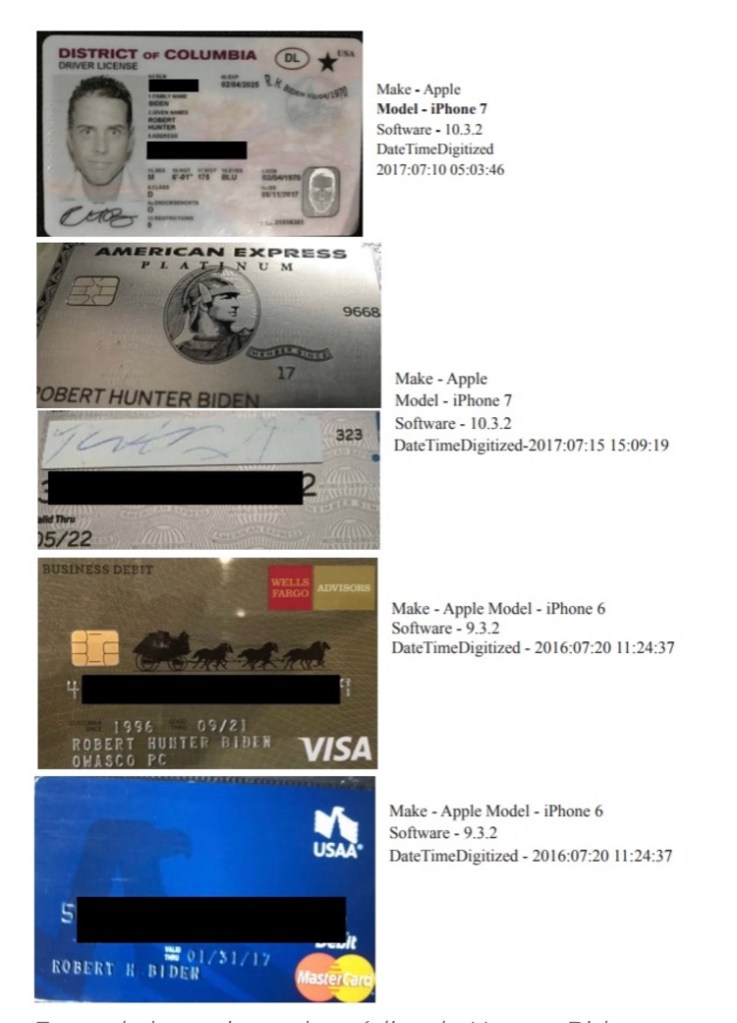Hunter Biden tomó docenas de fotos de sus tarjetas de identificación personal, incluidas licencias de conducir, tarjetas de crédito, su certificado de nacimiento, tarjeta de seguridad social y su tarjeta Global Entry, y las almacenó en su ordenador. Los metadatos vinculados a las fotos muestran que fueron tomadas por el mismo modelo de iPhone que Hunter Biden había vinculado a su cuenta de iCloud, y los correos electrónicos de la unidad contienen recibos de Apple que muestran que Hunter Biden pagó por esa misma cuenta de iCloud mensualmente.