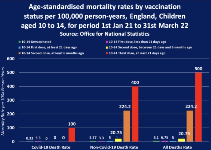 Estas cifras son horribles. Los datos de la ONS muestran que entre el 1 de enero y el 31 de marzo de 22 de 22 años, los niños vacunados dobles de 10 a 14 años tenían estadísticamente hasta 39 veces más probabilidades de morir que los niños no vacunados, y los adolescentes vacunados dobles de 15 a 19 años tenían estadísticamente hasta 4 veces más probabilidades de morir que los adolescentes no vacunados.
