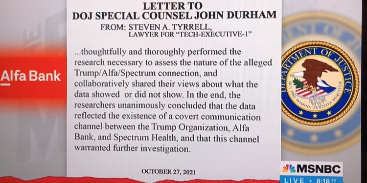 Pero, al parecer, Sussmann y Hillary Clinton por poder no fueron las únicas que mintieron. Según los documentos presentados por Durham, el FBI mintió sobre la procedencia de la difamación del Alfa Bank, diciendo a los agentes que había venido del Departamento de Justicia. En realidad, Sussmann lo había llevado directamente al FBI, siendo conscientes de sus orígenes como una investigación política de la oposición mal hecha.