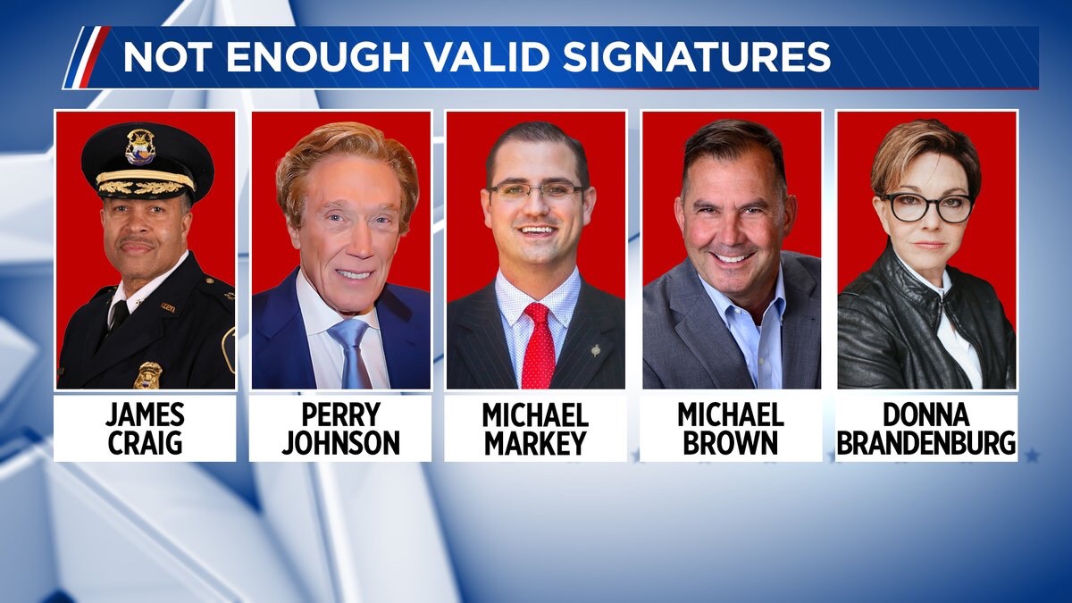 Los otros tres candidatos incluyen a Michael Markey, el capitán de la policía estatal de MI, Michael Brown, y Donna Brandenburg. La Oficina de Elecciones del Estado de MI les notificó que se habían identificado miles de firmas fraudulentas en sus peticiones de nominación, lo que los puso a todos en peligro de ser eliminados de la boleta primaria en agosto.