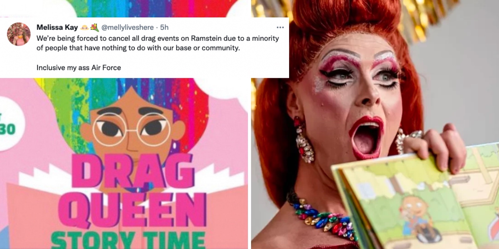 La biblioteca de la base de la Fuerza Aérea de los Estados Unidos de Ramstein en Alemania canceló Drag Story Hour para niños después de informar desde The Post Millennial. La base, en la que están estacionados 54 000 militares estadounidenses, acompañados por más de 5.400 empleados civiles estadounidenses, había celebrado una Hora de la Historia de Arrastrar en 2021 y estaba programada para celebrar una de nuevo.