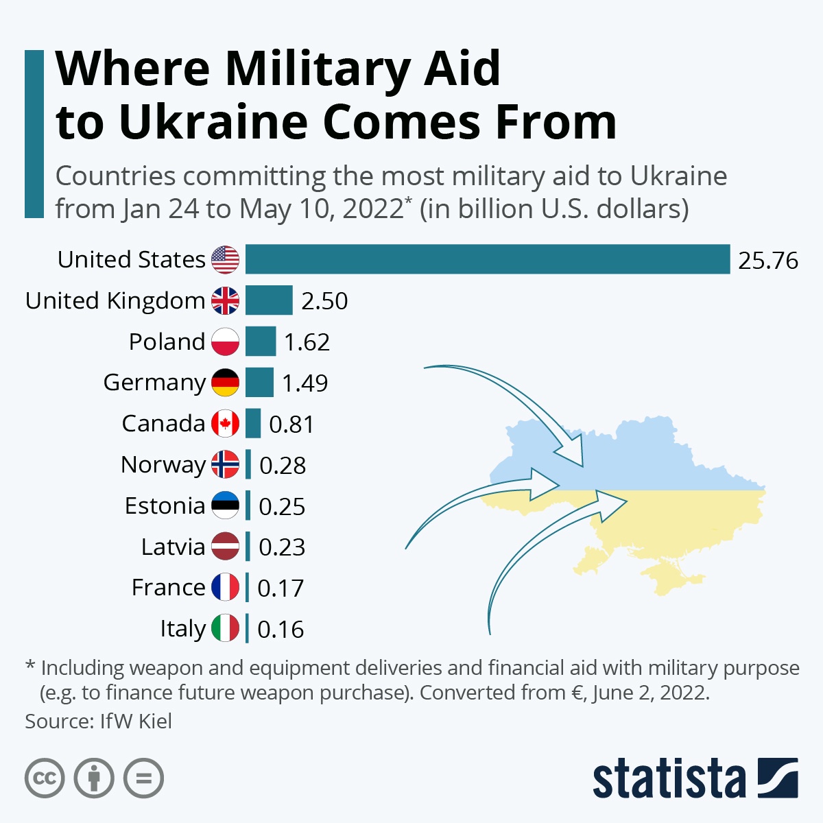 Mirando las promesas de ayuda militar a Ucrania entre el inicio de la invasión rusa y el 10 de mayo, Katharina Buchhlz de Statista detalla a continuación que el gobierno de los Estados Unidos se ha comprometido a proporcionar la mayor cantidad de armas, armas y otros equipos con diferencia.