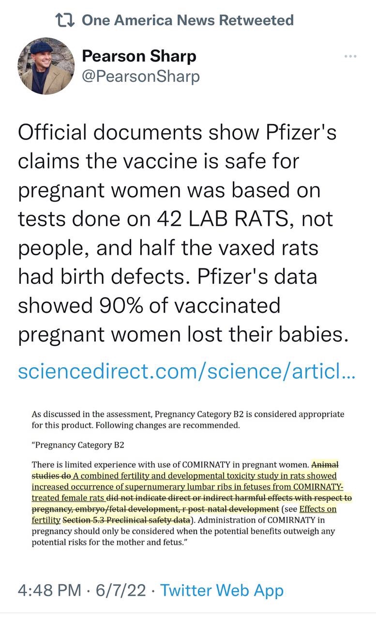 La enfermedad por coronavirus 2019 (COVID-19) ha afectado a decenas de millones de personas en todo el mundo desde que la Organización Mundial de la Salud (OMS) la declaró pandemia el 11 de marzo de 2020 [ 1 ]. Los adultos mayores, las personas con ciertas condiciones coexistentes y los trabajadores de primera línea corren el mayor riesgo de contraer COVID-19 y sus complicaciones y, como tal, los Centros para el Control de Enfermedades recomendaron priorizar la vacunación de estas poblaciones. Datos recientes han demostrado que otras poblaciones, incluidas las mujeres embarazadas, también pueden tener un mayor riesgo [ 2 ,3 ]; sin embargo, las mujeres embarazadas fueron excluidas de los ensayos clínicos iniciales [ 4 , 5 ] hasta que se demostraron suficientes datos de seguridad en adultos no embarazadas. https://t.me/QAnons_Espana