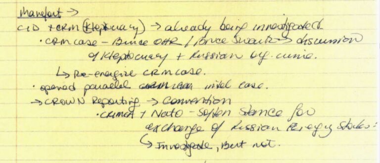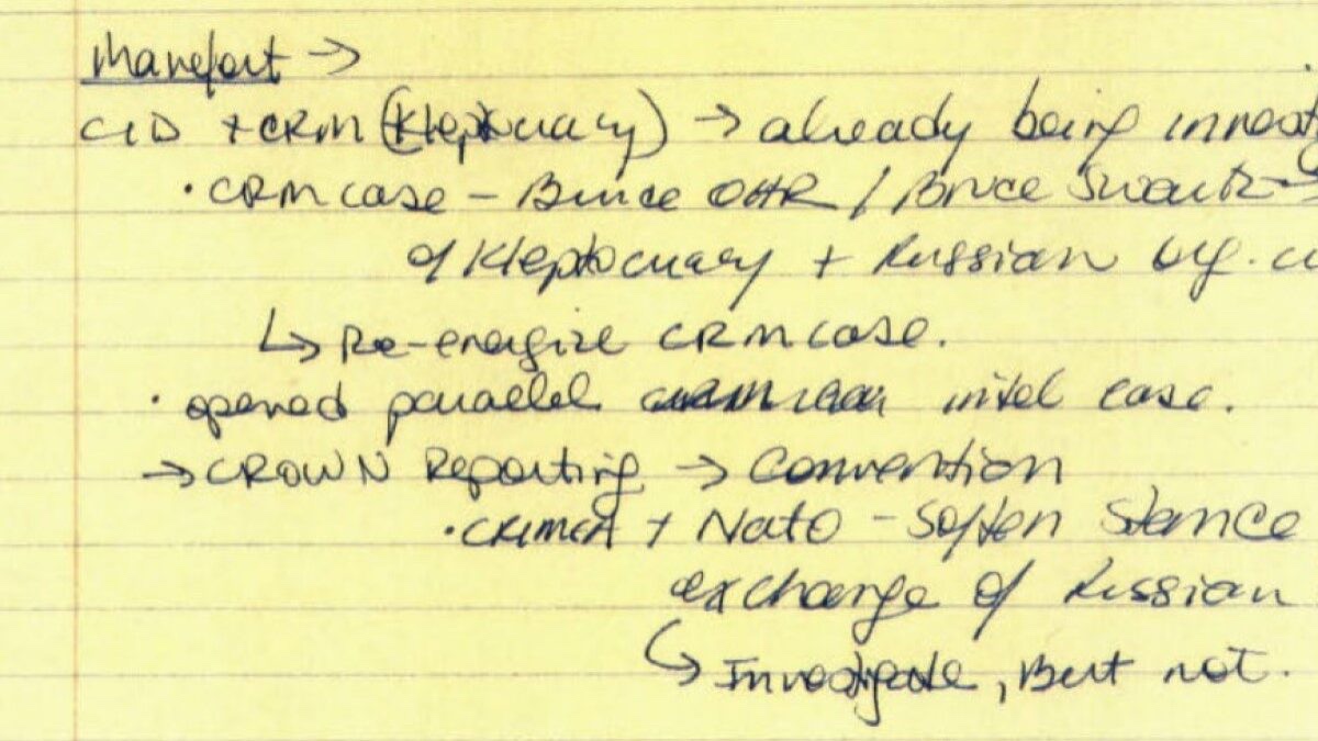 La frase «Informe de CORONA» apareció varias veces en un conjunto de notas manuscritas tomadas durante la sesión informativa del FBI del Departamento de Justicia y el Fiscal General interino de McCabe, Priestap y Strzok del 6 de marzo de 2017. Junto a «Informes de CORONA», las notas hacían referencia a «convención», Crimea» y «OTAN» y «suavizar la postura para el intercambio de reservas de energía rusas». Estas notaciones cayeron bajo el encabezado de los puntos relacionados con Manafort.