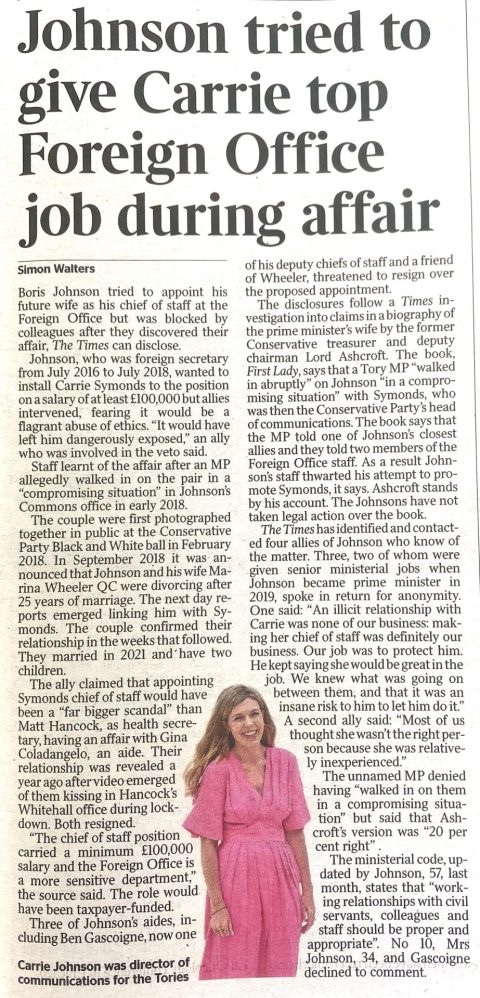 El sábado por la mañana, The Times of London corrió con una primicia de bomba del veterano reportero Simon Walters, titulada «Johnson trató de darle a Carrie el mejor trabajo del Ministerio de Asuntos Exteriores durante la aventura».