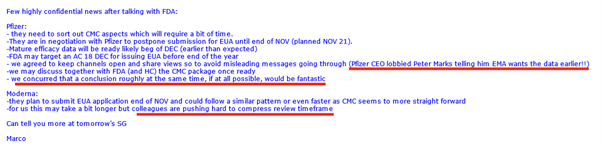 En un correo electrónico de Marco Cavaleri, en ese momento, el Jefe de la Estrategia de Amenazas Biológicas para la Salud y Vacunas de la EMA, comunicó con urgencia cómo los EE. UU. La FDA «se apresurará a entrar en la EUA».