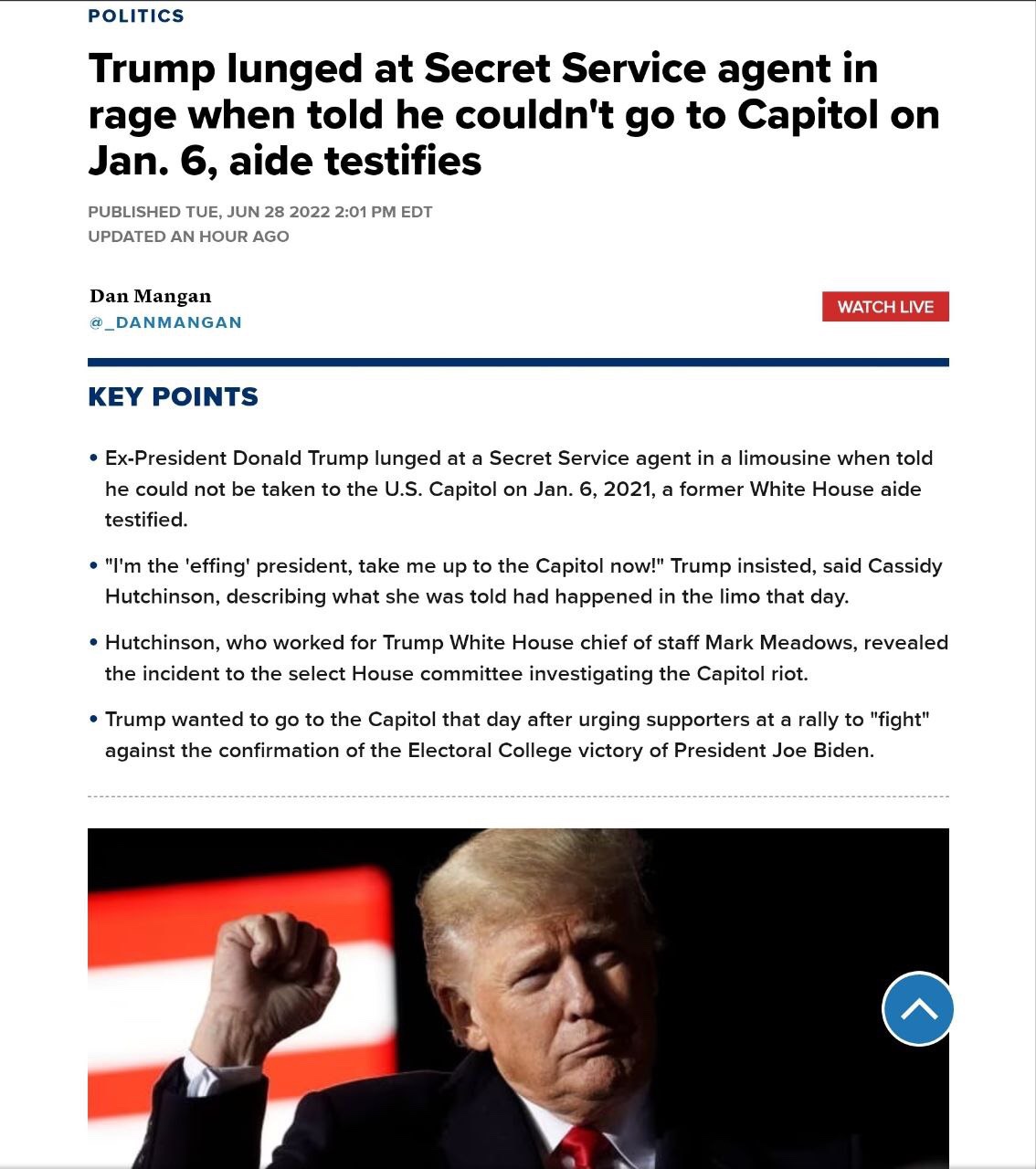 - “¡Soy el presidente ‘maldito’, llévame al Capitolio ahora!” Trump insistió, dijo Cassidy Hutchinson, describiendo lo que le dijeron que había sucedido en la limusina ese día.