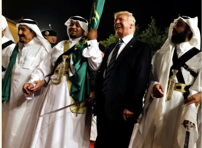 Trump y Bin Salman, la Corona Saudí y la icónica danza de la espada, solo reservada para después de las «victorias militares». Trump tiene una relación estelar con Bin Salman y han invertido por completo las relaciones de Estados Unidos con Arabia Saudí. Después de que los príncipes corruptos fueran ejecutados por traición y trata de personas, por supuesto. (Sí, soy consciente de que Arabia Saudí aún no forma parte de los BRICS, pero Arabia Saudí está ayudando a Rusia en su guerra en Ucrania y está en conversaciones para unirse a los BRICS lo antes posible)