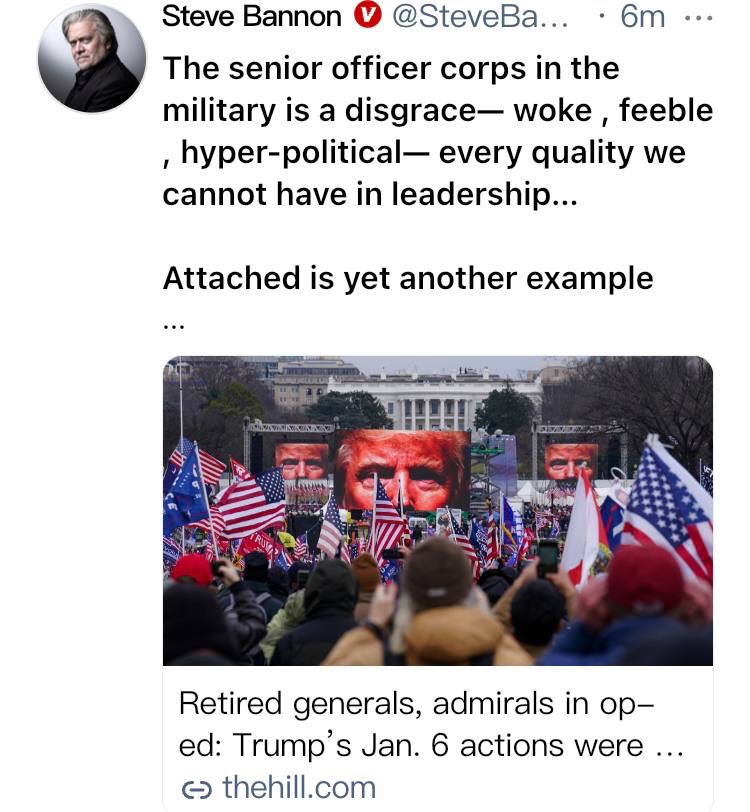 En el artículo de opinión, el jubilado Gens de cuatro estrellas. Peter Chiarelli, John Jumper y Johnnie Wilson y Adms jubilados. James Loy, John Nathman, William Owens y Steve Abbot criticaron a Trump por su inacción el 6 de enero y la consideración de utilizar al ejército en esquemas previos a ese día.