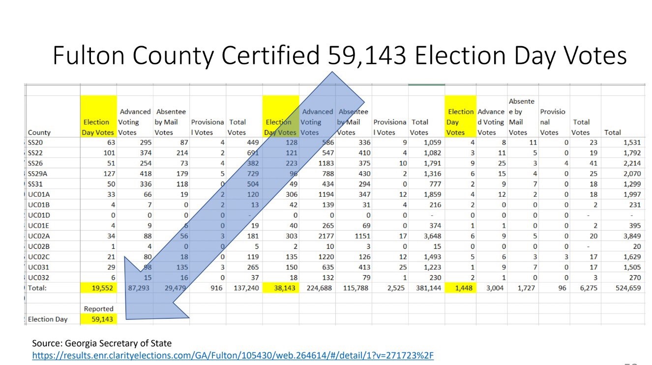 En este artículo, me gustaría destacar el análisis realizado por David Cross y su equipo. El Sr. Cross descubrió que, usando la propia página de resultados del Secretario de Estado de Georgia , afirmaron tener 59,143 votantes en persona el 3 de noviembre de 2020. Puede ver el segmento que hice con el Sr. Cross en el video de arriba.