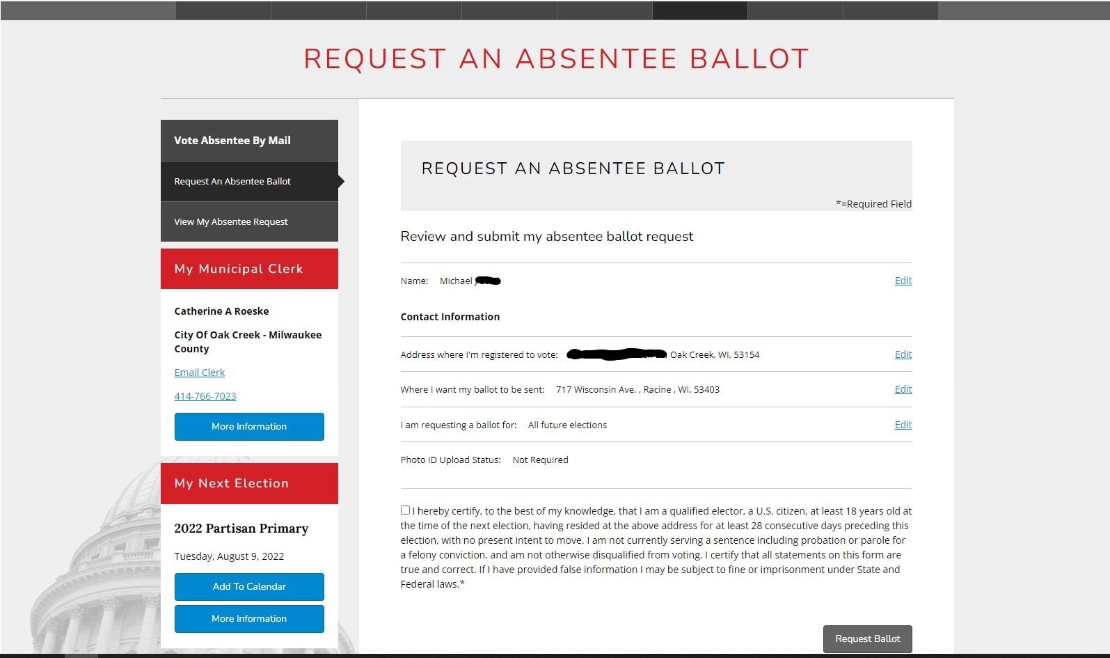 Ayer por la noche, para demostrar con qué facilidad se pueden solicitar indebidamente boletas de voto en ausencia, me conecté a Internet y pedí con éxito que se enviaran a mi dirección boletas de voto en ausencia a nombre de Cory Mason y Robin Vos. Seleccioné a estas dos figuras públicas de alto perfil porque son infractores de la ley, no tienen respeto por la ley y se encuentran entre los estafadores más falsos y notorios dentro de nuestro estado. Ambos, a su manera, han contribuido a la desaparición de la falta de confianza del público en nuestras elecciones.