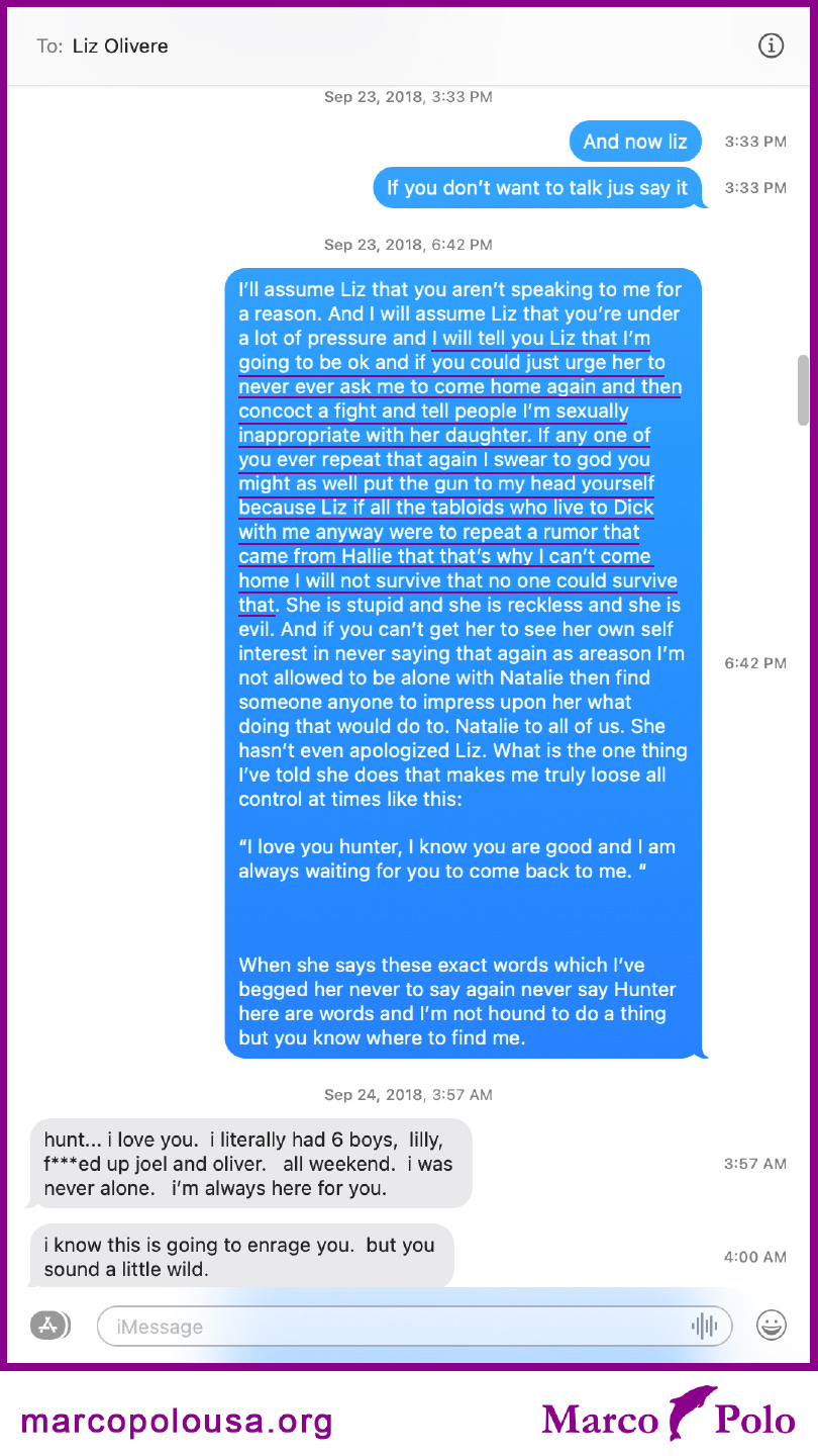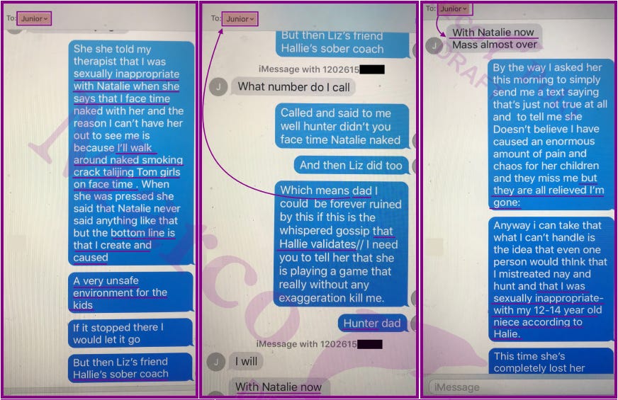 El 23 de septiembre de 2018, en una conversación con Joe, Hunter le dijo a su padre: «le dijo a mi terapeuta que era sexualmente inapropiado con Natalie cuando dice que me enfrento al tiempo desnudo con ella y la razón por la que no puedo tenerla a verme es porque caminaré desnudo fumando crack talijing chicas de Tom en el tiempo cara a cara a cara» arruinado por esto es que este es el chisme susurrado que Hallie valida// Necesito que le digas que está jugando a un juego que realmente sin ninguna exageración me mata».