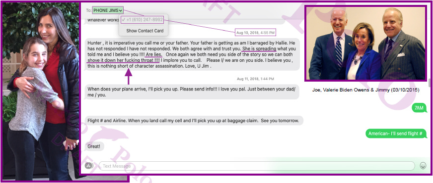 Pocos días después, el 10 de agosto de 2018, el tío de Hunter, Jimmy Biden, conspiró con él para suprimir las acusaciones de que Hunter estaba siendo «sexualmente inapropiado» con su sobrina: «Hunter, es imperativo que me llames a mí o a tu padre. Tu padre está recibiendo como yo bombardeado por Hallie. Él no ha respondido, yo no he respondido. Ambos estamos de acuerdo con usted y confiamos en usted. ¡¡¡¡Ella está difundiendo lo que me dijiste y te creo !!!! Son mentiras. Una vez más, ambos necesitamos tu lado de la historia para que ambos podamos meterlo por su puta garganta !!!! Te imploro que llames. Por favor, yo/estamos de tu lado. Te creo, esto es nada menos que un asesinato de carácter».