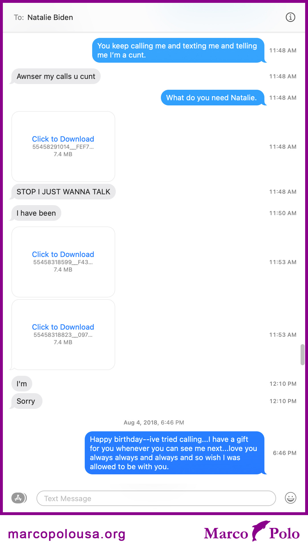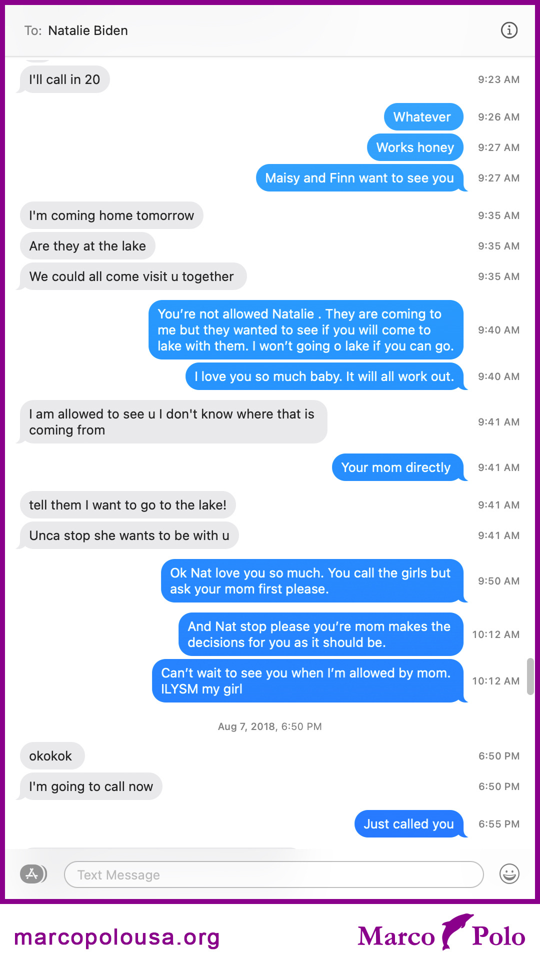 El 14 de julio de 2018, Hunter le dijo a su padre Joe: «Y, por cierto, le ha dicho a Natalie que puedo verla en cualquier momento, pero que quieres estar allí para su protección. Naomi no puede hacerlo porque puedo manipular a Naomi a través de la intimidación y hacer lo que quiera a Natalie. Lee esas palabras de nuevo, papá. Jesucristo, papá, la dejaste golpear y peligrosa subiendo a Filadelfia para que los escoltas masculinos conduzcan a los niños y los tengan solos. Dejaste que el tío Frankie fuera Beau y yo clases de conducción cuando estaba más jodido de lo que he visto a una persona… Cuando supe que Ash estaba usando y te dije que la dejabas llevar a los niños a la playa y de vuelta».