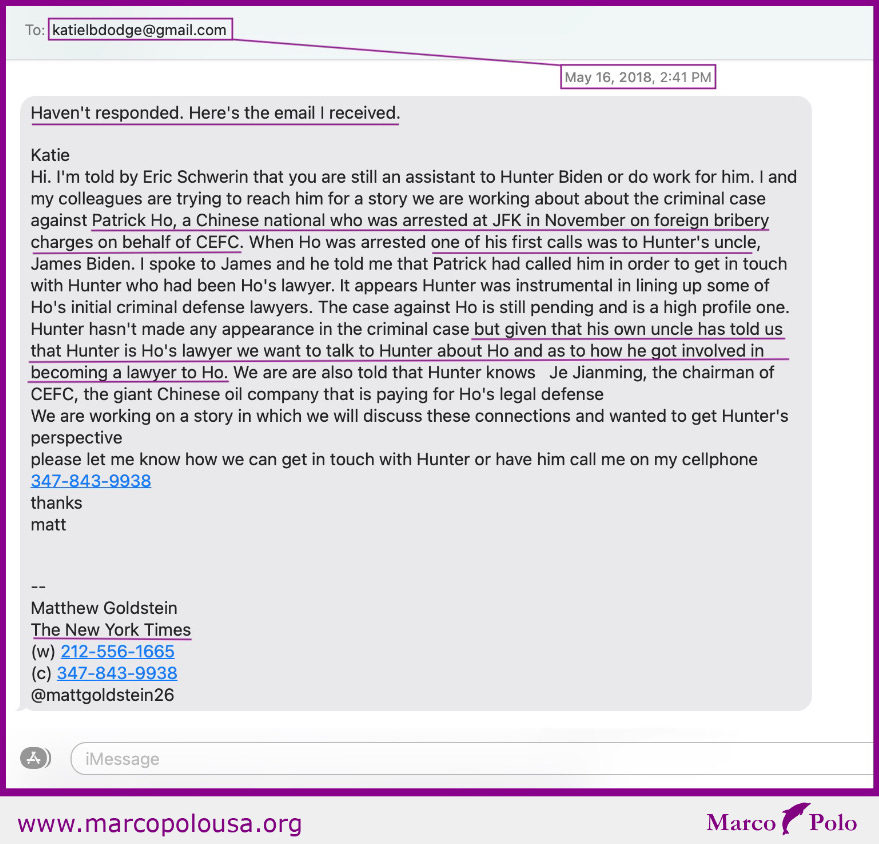 El 16 de mayo de 2018, el asistente de Hunter le reenvió un correo electrónico del reportero del New York Times Matthew Goldstein preguntando sobre la representación de Hunter de Patrick Ho: «Cuando Ho fue arrestado, una de sus primeras llamadas fue al tío de Hunter, James Biden. Hablé con James y me dijo que Patrick lo había llamado para ponerse en contacto con Hunter, que había sido abogado de Ho… También se nos dice que Hunter conoce a Je Jianming, el presidente de CEFC, la gigantesca compañía petrolera china que está pagando la defensa legal de Ho».