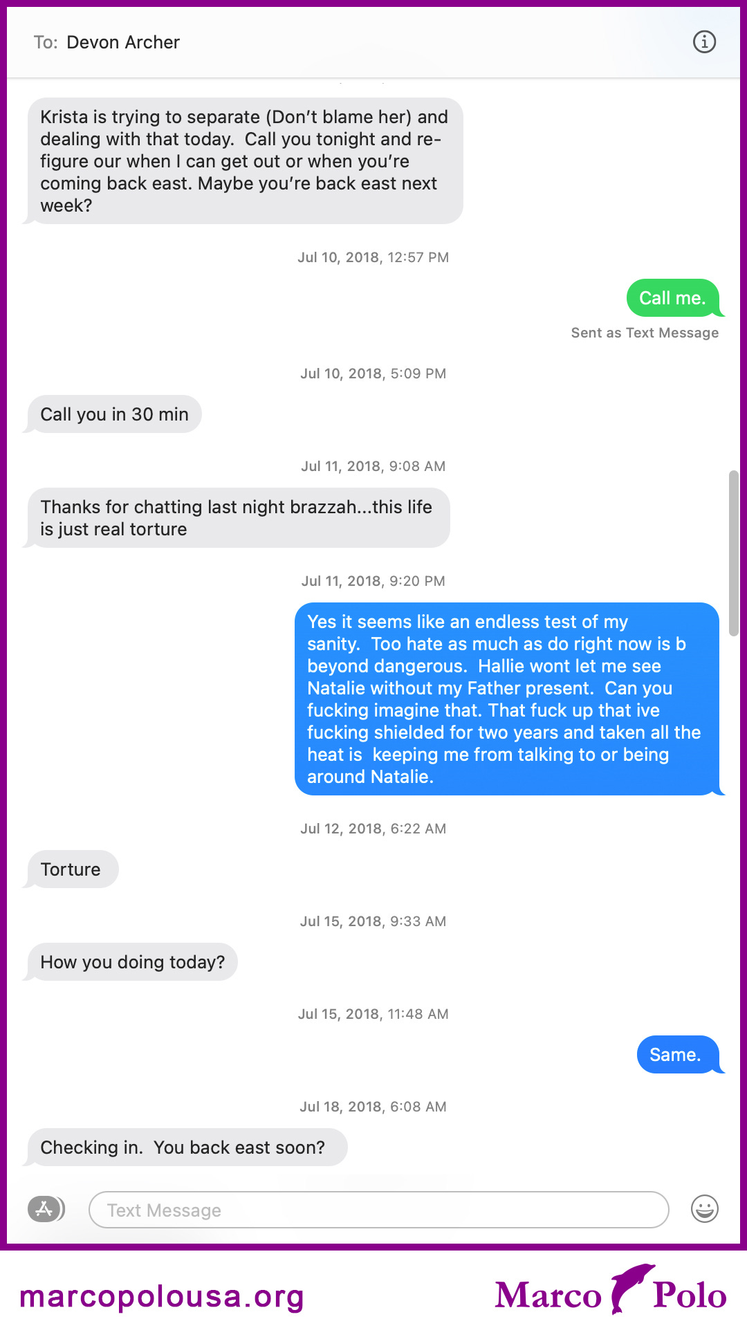 El 11 de julio de 2018, Hunter estaba hablando con su antiguo socio comercial, el delincuente convicto Devon Archer: «Sí, parece una prueba interminable de mi cordura. Demasiado odio como ahora mismo es más que peligroso. Hallie no me deja ver a Natalie sin la presencia de mi padre. ¿Te lo imaginas, joder? Esa mierda que me protegí durante dos años y me llevó todo el calor me impide hablar o estar cerca de Natalie».