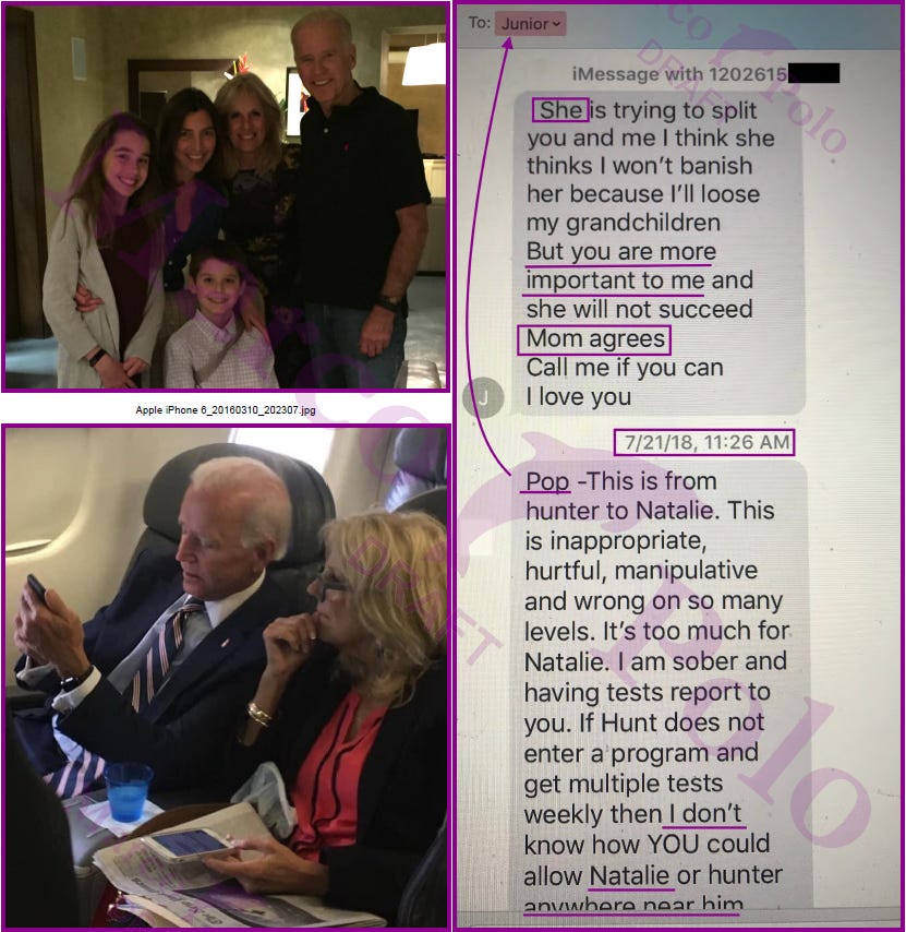 El 21 de julio de 2018, Joe Biden le dijo a su hijo Hunter: «Ella [Hallie] está tratando de dividirnos a ti y a mí, creo que piensa que no la desterraré porque perderé a mis nietos, pero tú [, Hunter,] eres más importante para mí y ella no tendrá éxito[.] Mamá está de acuerdo[.]”