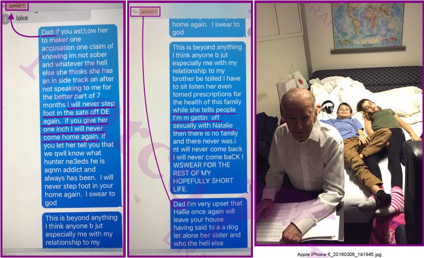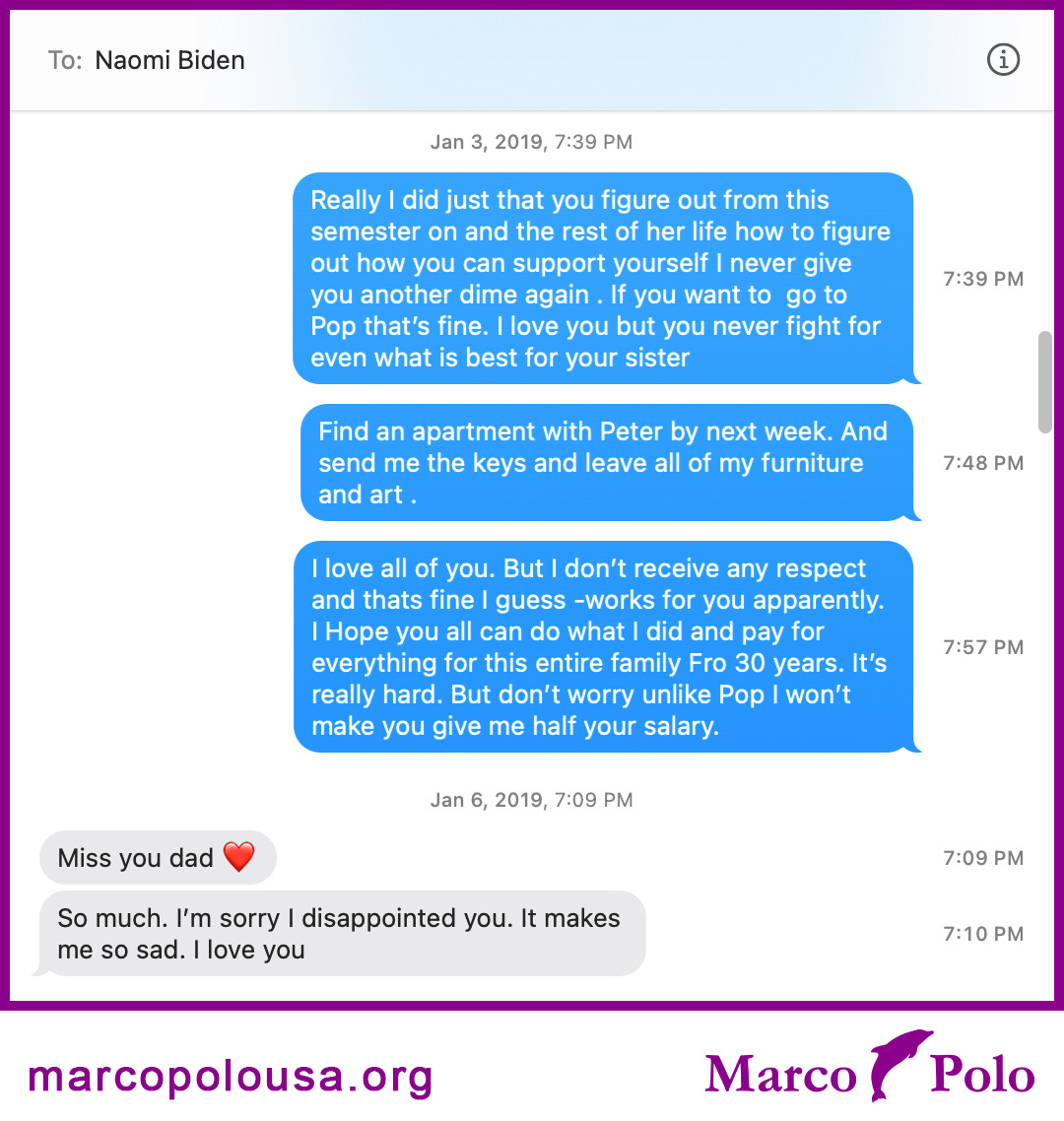El 3 de enero de 2019, en un iMessage a su hija mayor, Hunter confesó cómo Joe, durante tres décadas, no informó de los ingresos que recibió de Hunter: «Espero que todos puedan hacer lo que yo hice y pagar todo por toda esta familia de 30 años. Es muy difícil. Pero no te preocupes, a diferencia de Pop, no haré que me des la mitad de tu salario».