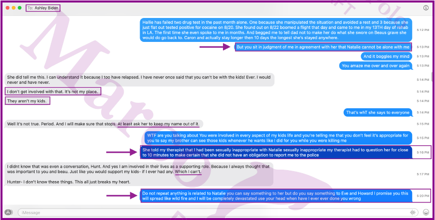 El 22 de septiembre de 2018, Hunter dijo a su media hermana, Ashley Biden: «Le dijo a mi terapeuta que había sido sexualmente inapropiado con Natalie sexualmente inapropiado, mi terapeuta tuvo que interrogarla durante casi 10 minutos para asegurarse de que no tenía la obligación de denunciarme a la policía[.]»