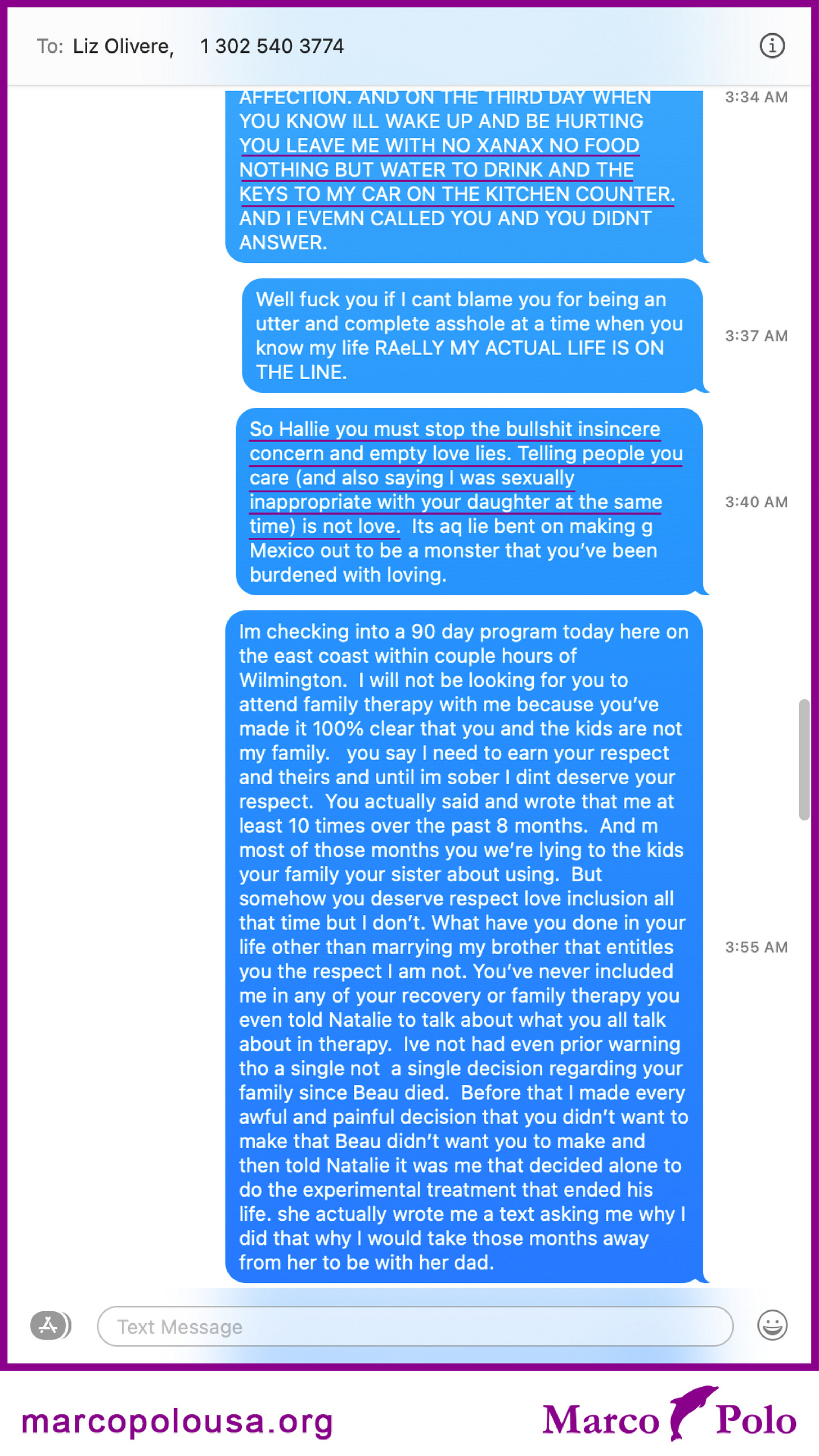 El 29 de diciembre de 2018, en otra diatriba inducida por las drogas, Hunter se quejó en una conversación grupal de iMessage con la viuda de su hermano y su hermana, Liz Olivere Secundy: «Así que Hallie, debes detener la preocupación insincera de mierda y las mentiras de amor vacías. Decirle a la gente que te importa (y también decir que fui sexualmente inapropiado con tu hija al mismo tiempo) no es amor».