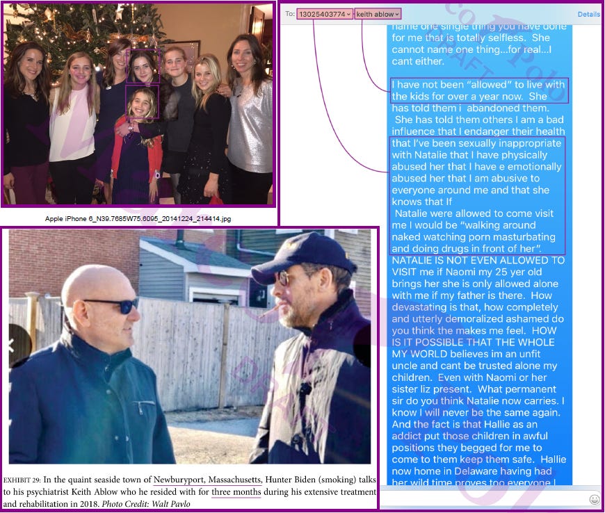 El 29 de enero de 2019, en una charla grupal de iMessage con la viuda de su hermano y su antiguo psiquiatra, Hunter dijo: «No se me ha «permitido» vivir con los niños durante más de un año. Ella les ha dicho a otros que soy una mala influencia que pongo en peligro su salud, que he sido sexualmente inapropiado con Natalie, que he abusado físicamente de ella, que he abusado emocionalmente de ella, que soy abusiva con todos los que me rodean y que sabe que si se permitiera a Natalie venir a visitarme, estaría «caminando desnuda viendo porno masturbándose y tomando drogas delante de ella». A NATALIE NI SIQUIERA SE LE PERMITE VISITARME si Naomi, mi hija de 25 años, la trae, solo se le permite estar sola conmigo si mi padre está allí. Qué devastador es eso, qué completa y completamente desmoralizado y avergonzado crees que me hace sentir».