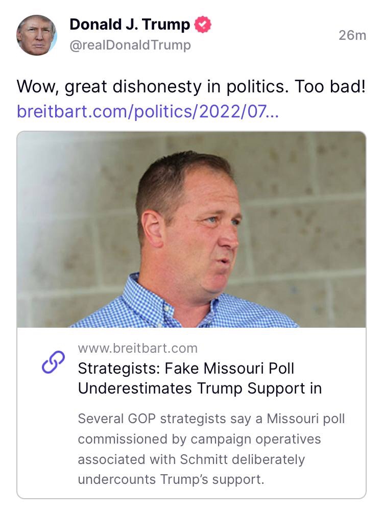 “Algo está mal con estos números, y uno debe preguntarse por qué”, dijo ese estratega a Breitbart News. “Tal vez sea porque la única forma en que el equipo de Schmitt puede alterar una encuesta para que parezca que está a la cabeza en las primarias del Senado de Missouri a días de las elecciones es golpeando a Trump e impulsando a los rivales potenciales percibidos en una candidatura inminente para 2024”. https://t.me/QAnons_Espana