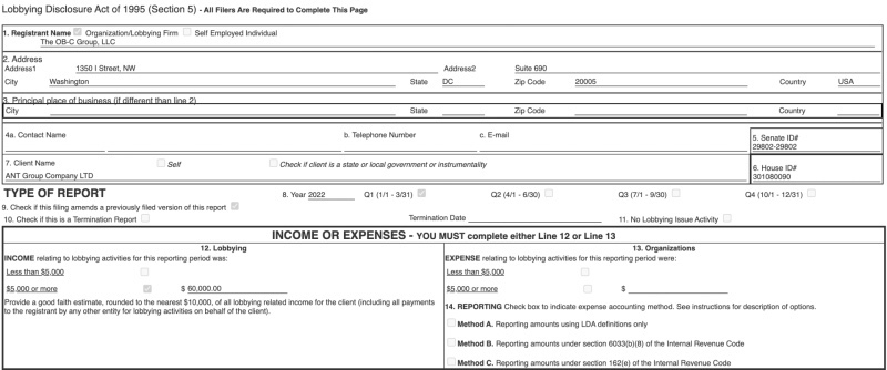 A lo largo de 2021 y 2022, Ant Group contrató a cuatro empresas externas de cabildeo y asuntos públicos para ayudar con objetivos que incluyen «divulgación con respecto al perfil corporativo y las operaciones de Ant Group y su filial Alipay US».