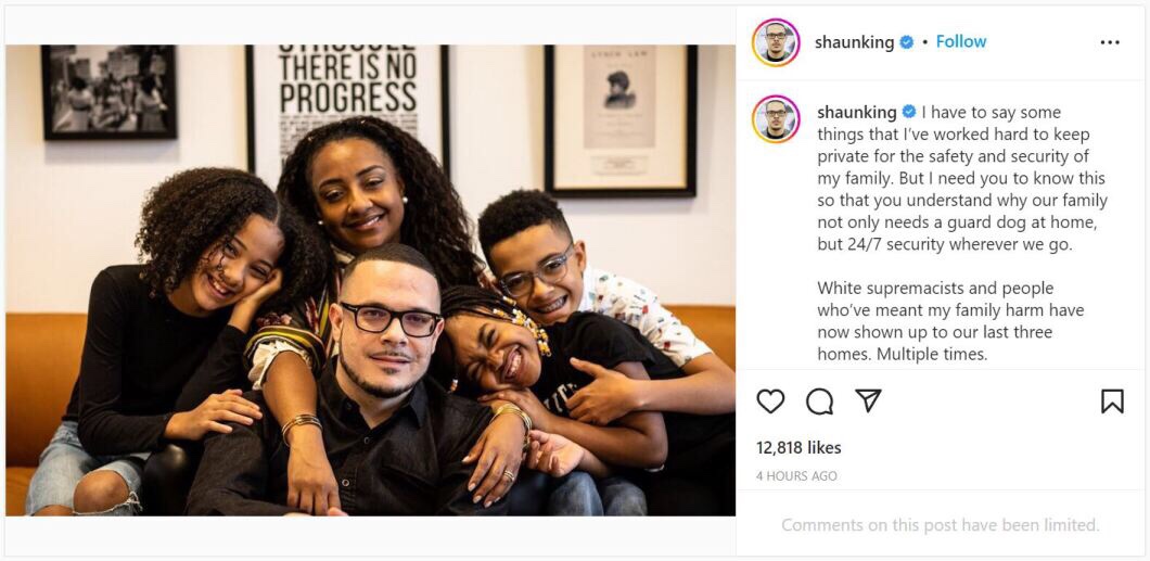 «Necesito que sepas esto para que entiendas por qué nuestra familia no solo necesita un perro guardián en casa, sino seguridad las 24 horas, los 7 días de la semana dondequiera que vayamos», escribió King. «Los supremacistas blancos y las personas que han querido dañar a mi familia ahora se han presentado en nuestras últimas tres casas. Varias veces».