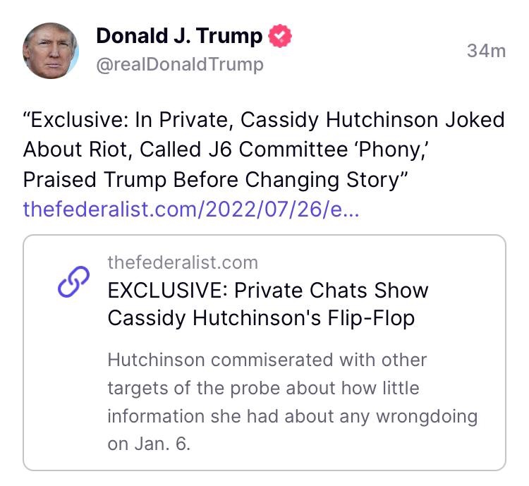 Sin embargo, en una serie de comunicaciones privadas desde diciembre de 2020 hasta mayo de 2021, compartidas exclusivamente con The Federalist, Hutchinson se compadeció con otros objetivos de la investigación sobre la poca información que tenía sobre cualquier irregularidad ese día y lamentó cuán corrupto era el comité politizado. Lejos de estar molesto con Trump, Hutchinson se pronunció reiteradamente a favor de él y su presidencia.