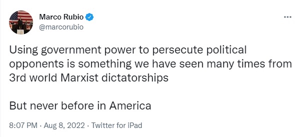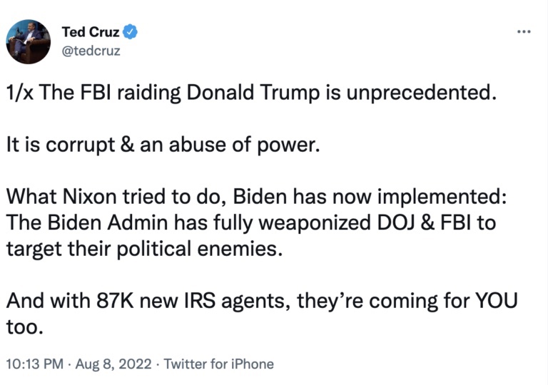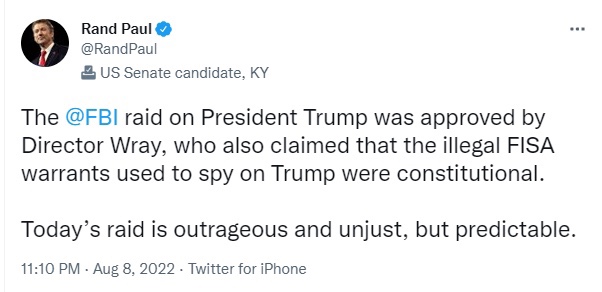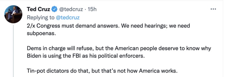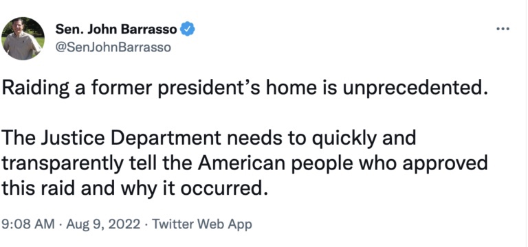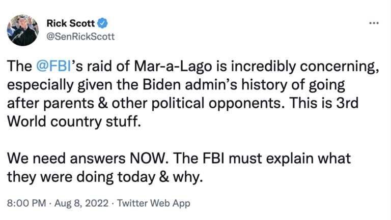 El martes por la mañana, Scott había anunciado que «cuando los republicanos retomen la mayoría en el Senado, habrá una investigación exhaustiva y agresiva sobre la redada de Mar-a-Lago por parte del @FBI».