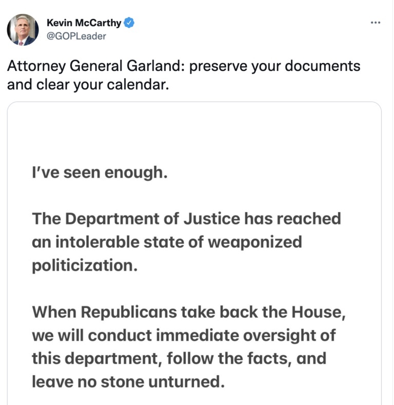 Mientras que el líder de la minoría de la Cámara de Representantes, Kevin McCarthy, se apresuró a condenar el «estado intolerable de politización armada» del Departamento de Justicia la noche de la redada e incluso anunció planes para «llevar a cabo la supervisión inmediata de este departamento», ni McConnell, el presidente del Comité de Política Republicana del Senado, Roy.