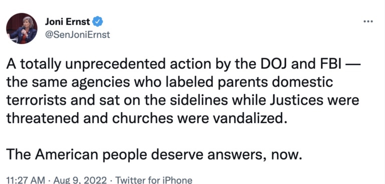 No fue hasta el martes que otros miembros del liderazgo, como el presidente republicano del Senado, John Barrasso, y la vicepresidenta de la Conferencia Republicana del Senado, Joni Ernst, se molestaron en reconocer la redada que sigue controlando el ciclo de noticias de esta semana.