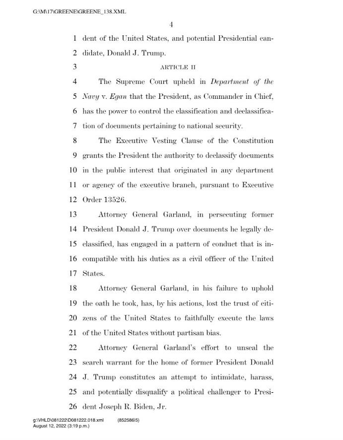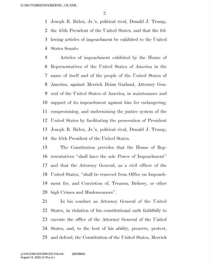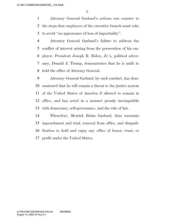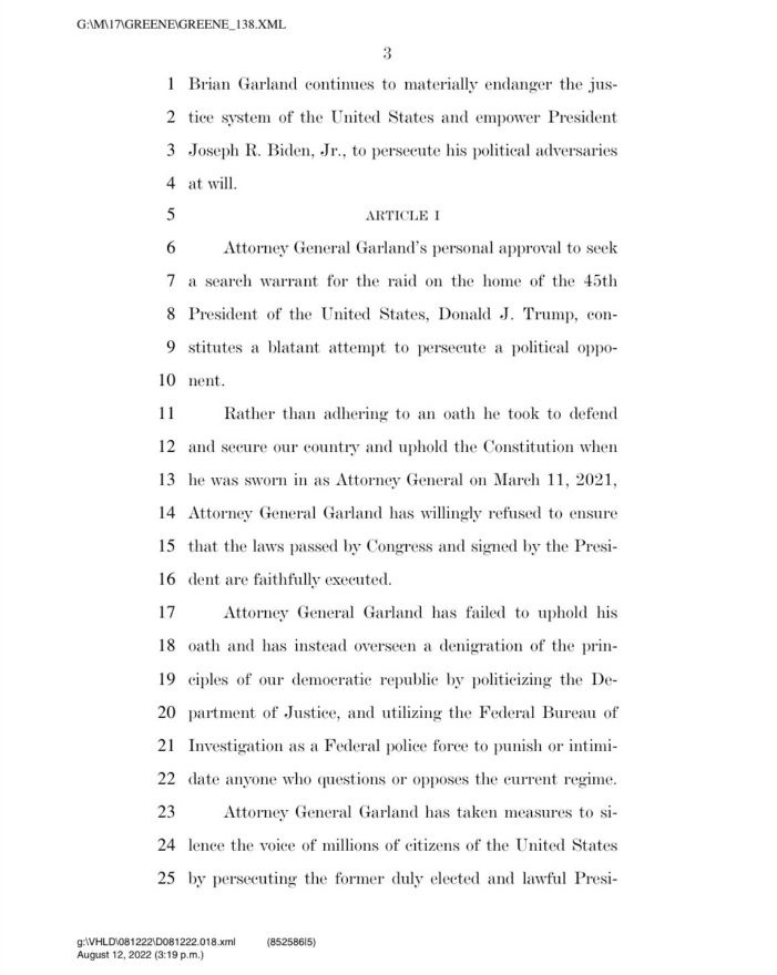 «Y todo el propósito de esto es evitar que el presidente Trump pueda ocupar el cargo», añadió Greene. “Así que estoy de camino a la capital ahora mismo. Y estoy presentando Artículos de Juicio Político sobre Merrick Garland, porque no podemos tolerar esto en Estados Unidos, donde nuestras grandes instituciones son manejadas y abusadas de tal manera que derrotan a los enemigos políticos de la gente. Para eso no sirve esto. Y nunca debería existir».