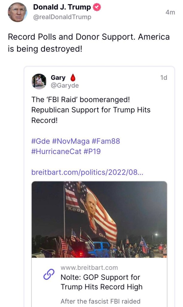 Después de que el FBI allanó la residencia privada de Donald Trump, el apoyo republicano al expresidente alcanzó un récord. https://t.me/QAnons_Espana