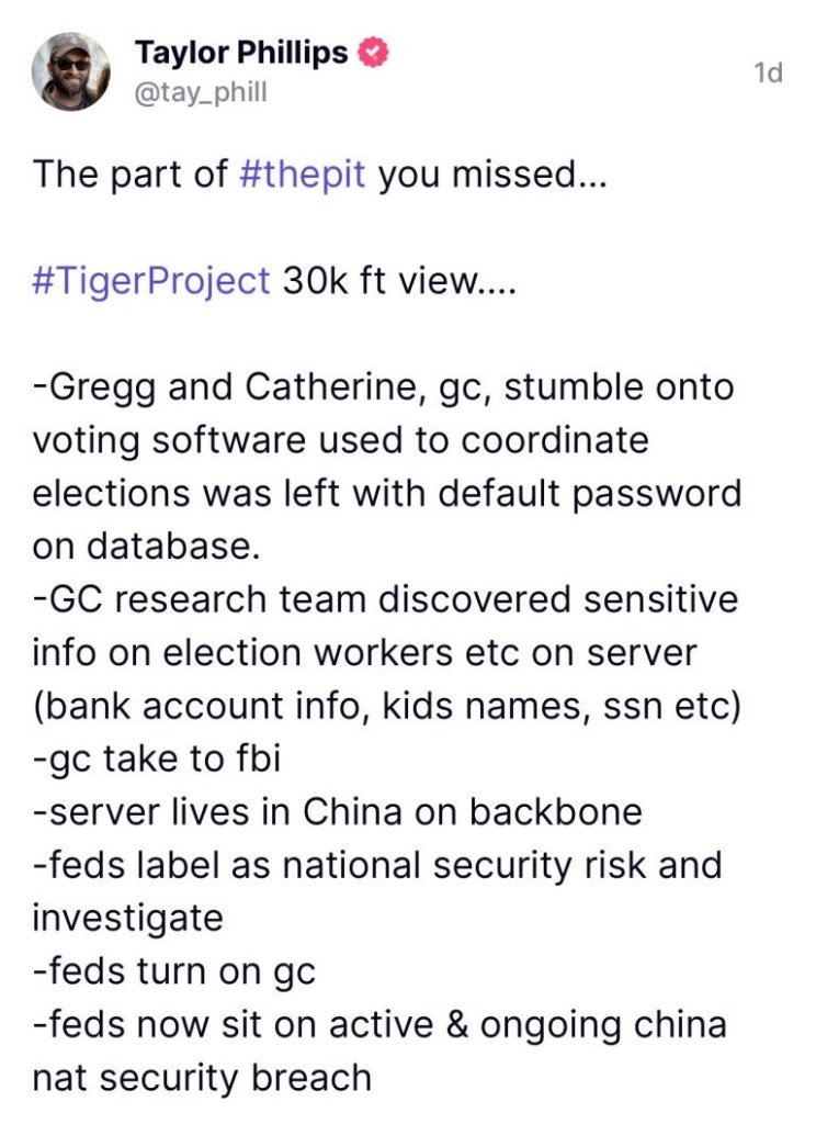 Se publicó información de que True the Vote hace muchos meses se topó con un servidor en China que True the Vote dice que contiene una gran cantidad de información personal sobre 1,8 millones de trabajadores electorales estadounidenses. Los datos se llevaron al FBI, que hasta ahora no ha hecho nada con ellos.