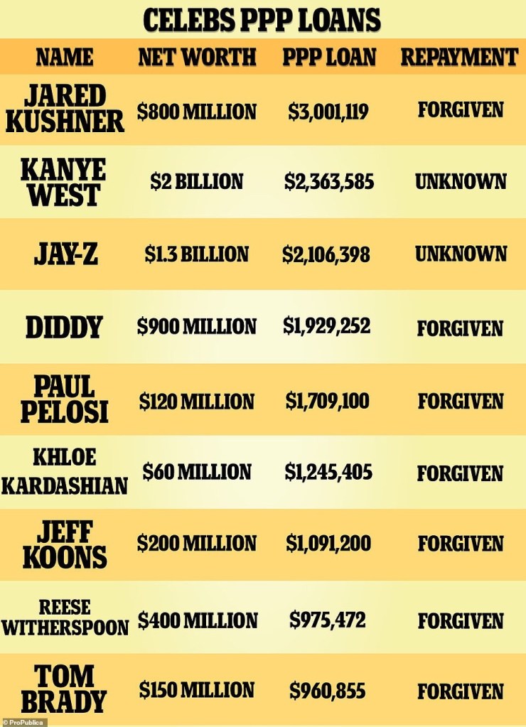 Las compañías de celebridades mega ricas, incluidos los multimillonarios Kanye West y Jay-Z, recibieron millones en préstamos PPP del gobierno, y en prácticamente todos los casos, los A-listers se han liberado de pagar el monto total.