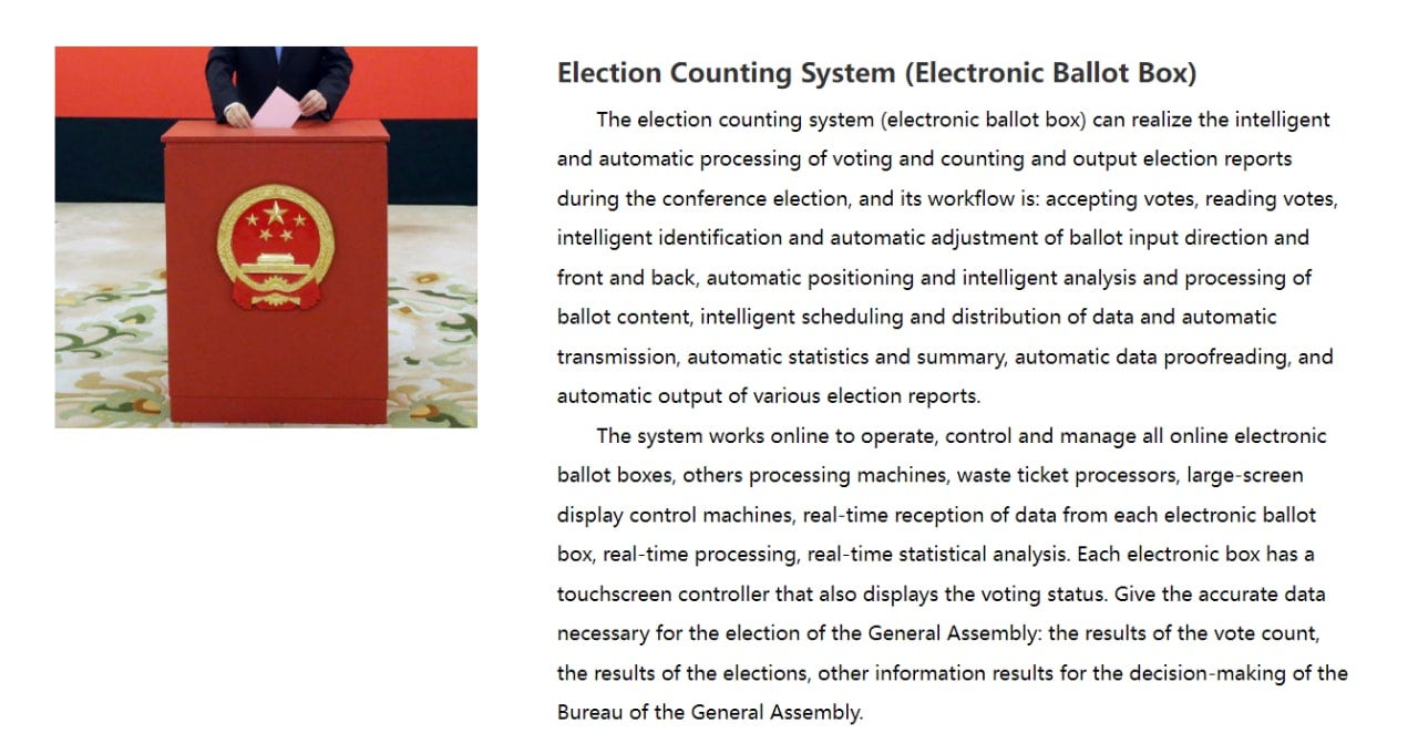 Por último, un artículo del 17 de diciembre de 2020 describe la destreza tecnológica de Jinhua Hongzheng Technology Co., Ltd. y revela que «el personal de la Oficina de Ciencia y Tecnología del Distrito» da regularmente orientación a la empresa china de software electoral «recordándonos que debemos ser conscientes de la importancia de los derechos de propiedad intelectual y las patentes mientras exploramos la