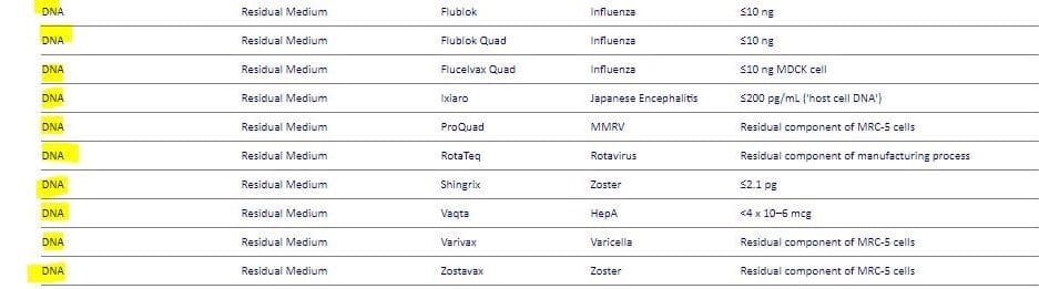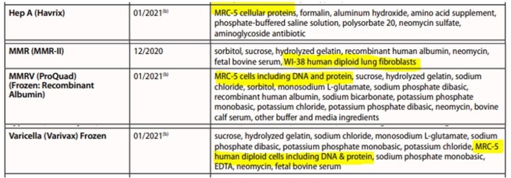 El uso de células fetales abortadas en la producción de vacunas ha estado ocurriendo durante más de 50 años, desde mediados hasta fines de la década de 1970. [8] Los antígenos de varias vacunas infantiles se cultivan en líneas celulares fetales abortadas MRC-5 y WI-38. Estas líneas celulares se encuentran en las vacunas y están incluidas en la lista de excipientes de vacunas de los CDC, así como en el sitio web del Instituto Johns Hopkins para la seguridad de las vacunas (imágenes superior e inferior respectivamente). [9] https://t.me/QAnons_Espana
