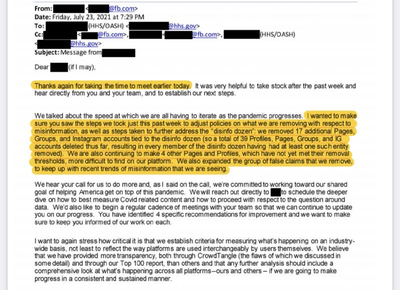 El mismo alto funcionario envió un correo electrónico adicional al Departamento de Salud y Servicios Humanos, señalando: «Gracias de nuevo por tomarse el tiempo de reunirse hoy temprano». Luego, el funcionario continuó discutiendo las medidas que Facebook estaba implementando para abordar la «desinformación» de COVID-19, incluida la eliminación masiva de páginas e individuos de la plataforma.