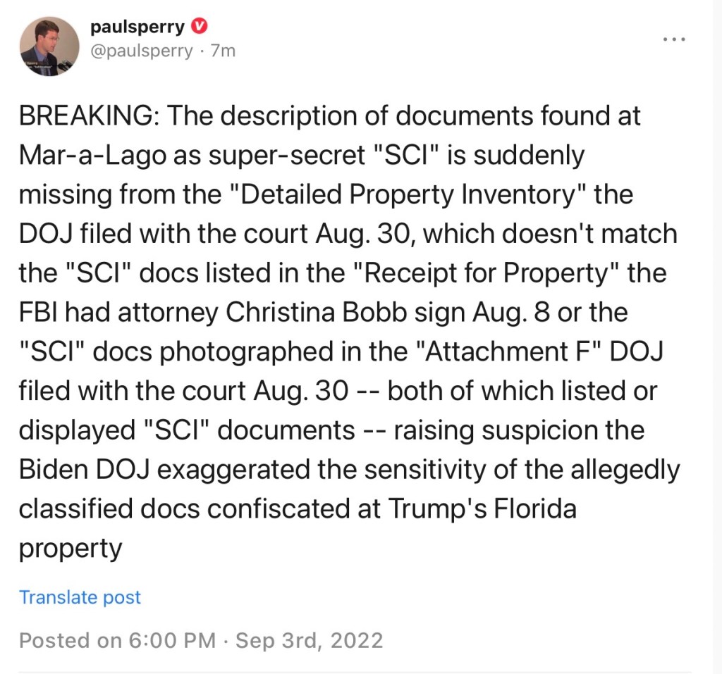 Paul Sperry: ÚLTIMA HORA: Ha surgido una gran discrepancia entre el «inventario detallado de propiedades» del Departamento de Justicia presentado ante el tribunal y el recibo de inventario que el FBI le dio al abogado de Trump el día de la búsqueda. En ninguna parte de la hoja de inventario detallada enumera los documentos con «Documentos Top Secret/SCI» como se indica en el artículo «2A» del recibo. Además, la foto de los artículos «2A» muestra las portadas con «Top Secret/SCI» en ellos, una vez más, el inventario detallado no tiene en cuenta ningún material de SCI, que es la información clasificada más sensible que requiere lectura en una instalación segura de SCIF. ¿De hecho, no se encontró material de este tipo en Mar-a-Lago? ¿El Departamento de Justicia engañó al tribunal, y al público, con esa foto escenificada que incluyó como exposición?
