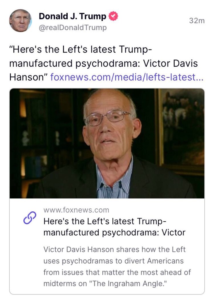 FUENTE 👉 https://www.foxnews.com/media/lefts-latest-trump-manufactured-psychodrama-victor-davis-hanson